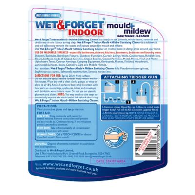 Designed for use on washable surfaces, especially in damp areas such as bathrooms, showers, kitchens, basements, bedrooms and laundry areas where mould and mildew can easily build up, Wet & Forget kills 99.9% of bacteria and viruses, while inhibiting the growth of mould and mildew and removing the stains and odours caused by them. Cutting through tough grease and grime to leave your surfaces clean, the bleach-free formula releases no harsh or irritating fumes, so it’s better for your health too.